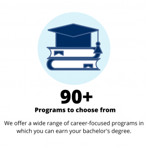 You can choose from 90+ bachelor’s degrees and undergraduate certificates. The bachelor’s degree programs require 120 credits to complete, and the undergraduate certificates are as low as 24 credits to complete. Look at our academic programs and find what meets your goals.