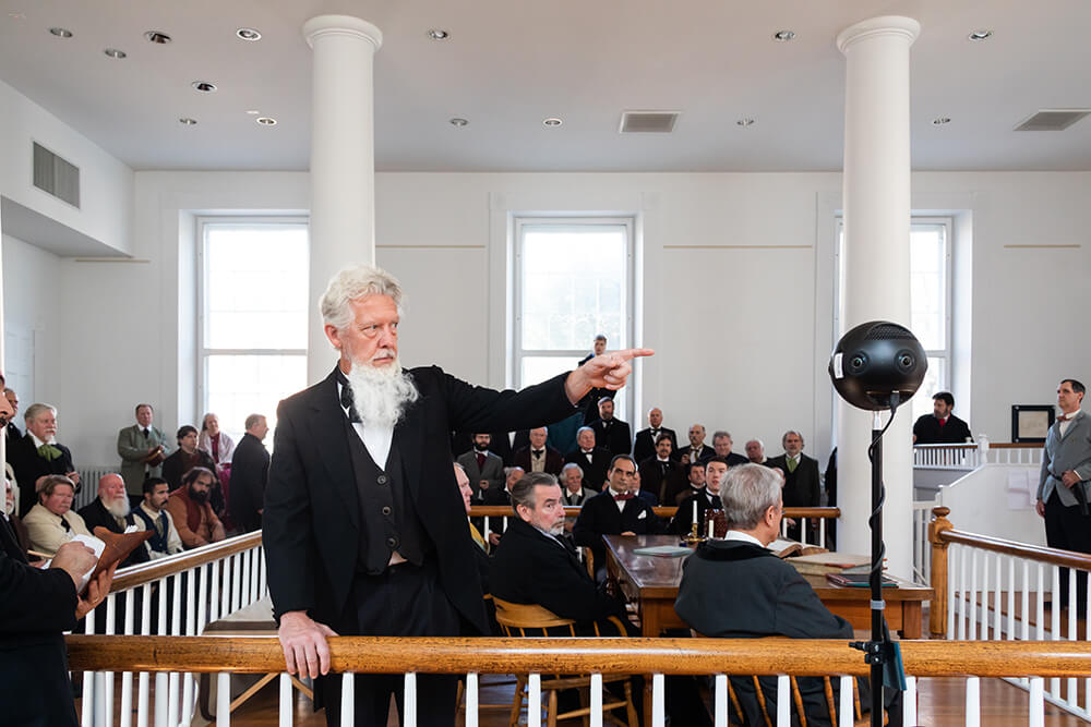 The Shenandoah Center for Immersive Learning (SCIL), in coordination with Shenandoah’s McCormick Civil War Institute and the Shenandoah Valley Battlefields Foundation, re-created John Brown’s historic trial for a virtual reality film project. The virtual reality experience can be viewed at the Shenandoah Valley Civil War Museum. Museum visitors who put on the 360-degree VR headsets find themselves sitting in the courtroom for one of the most momentous trials in American history. Users are fully immersed in the tense environment, surrounded by reporters and a raucous crowd, and have an up-close look at John Brown’s memorable closing remarks. Narration and period imagery tie together the experience and help viewers to understand why this was such a pivotal moment in America’s history and the spark that lit the fuse of the Civil War.