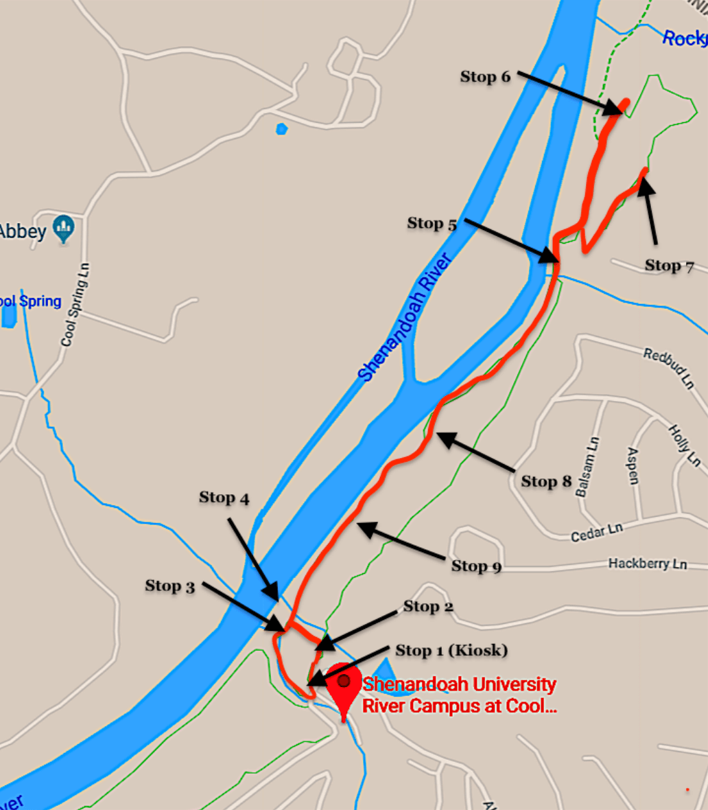 The tour begins at the kiosk located near the end of the parking lot located closest to the Shenandoah River. The walking tour is approximately 2 miles round-trip and takes you over some uneven terrain so please watch your step. Please see the trail map on the last page of this guide to assist you in navigating the property. Tour markers are also located along the trail to assist in navigation.