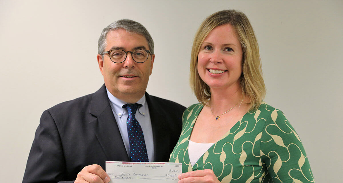 Photo: Judith Pascarella ’17 and Distinguished Professor & Director of the Division of Physician Assistant Studies Anthony A. Miller, M.Ed., PA-C, with Pascarella’s Veterans Caucus scholarship award.