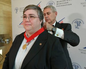 Annette Amerman (AS ’97) is a supervisory historian for the U.S. Marine Corps in Quantico, Virginia. Amerman recently received the Simmons-Shaw Award for Public History by the Marine Corps Heritage Foundation for her work on commemorating marines in World War I through her book and work on the WWI Symposium. (Pictured to the right.)