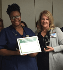 Jovanna Wiggins (N ’17) won the DAISY Award at the Virginia Hospital Center in Arlington, Virginia, for her extraordinary compassionate care. (Pictured to the right.)