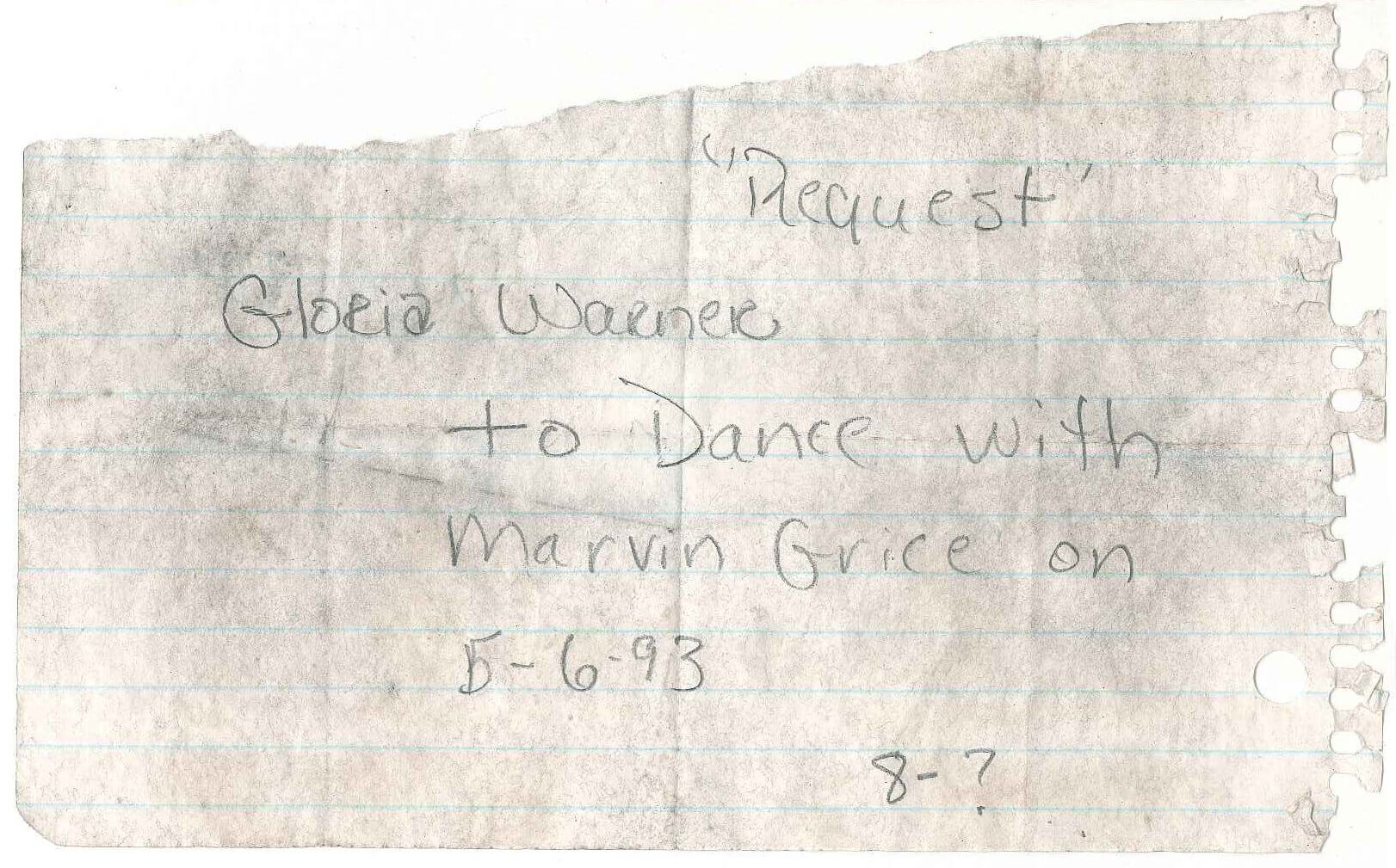 A note that reads “Request: Gloria Warner, To dance with Marvin Grice on 5-6-93. 8-?” Marvin Everette Grice, Jr. was a graduating Bachelor of Music in Performance student and we can only assume that his dance request was accepted by Gloria!