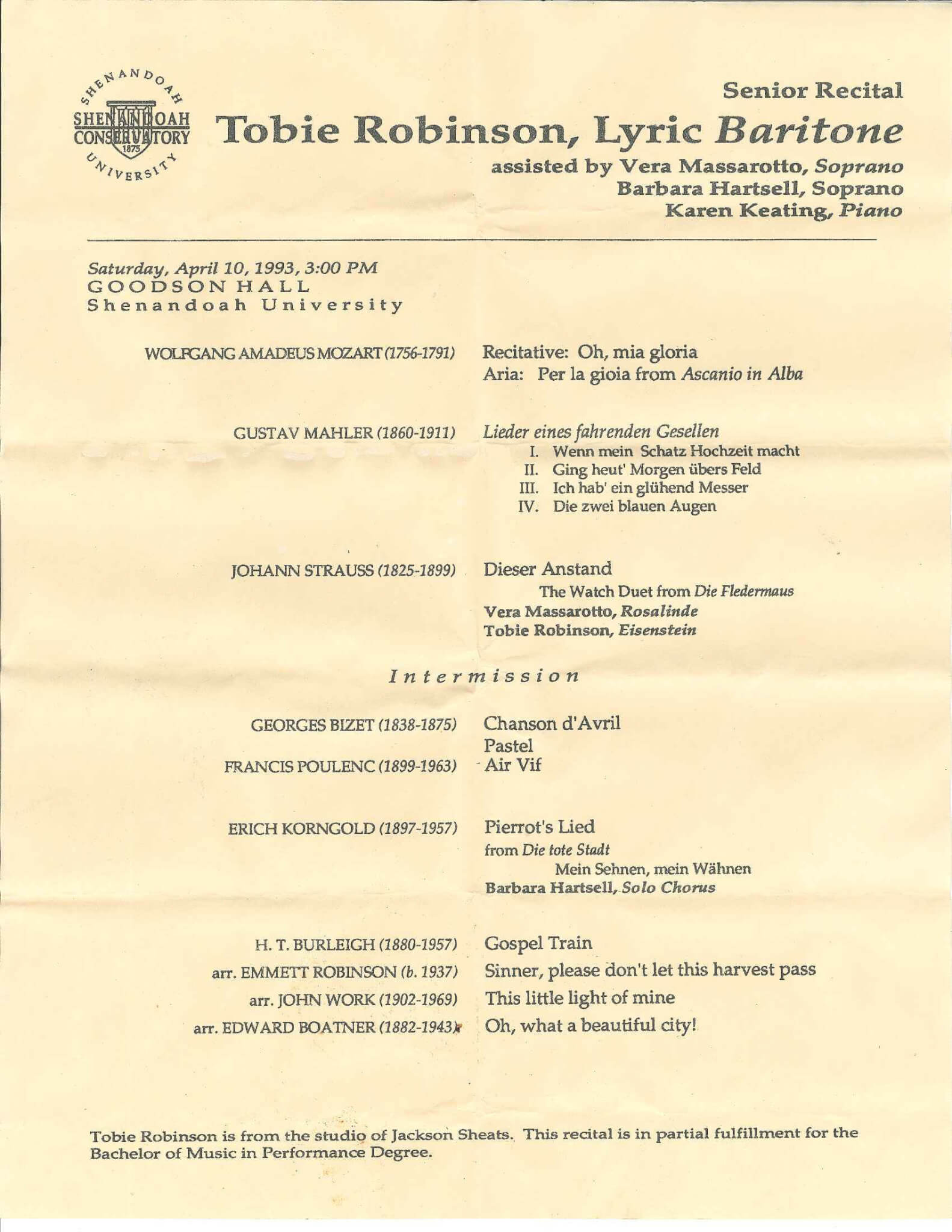 Bachelor of Music in Performance graduate Tobie Norwood Robinson ‘93, lyric baritone, included the program to his senior recital held at 3 p.m. on April 10, 1993. In his recital, he was assisted by Vera Massarotto, soprano; Barbara Hartsell, soprano; and Karen Keating on piano. He also included a cassette tape recording of his recital which still plays!