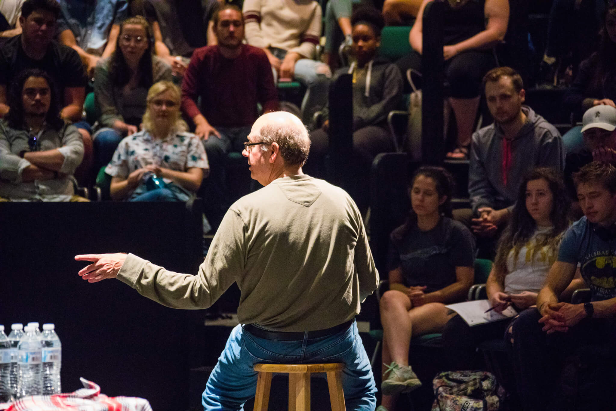 During the Q&A, he took a pair of students through the Meisner technique (on which Shenandoah’s acting program focuses) “repetition exercise,” which has four levels, which begin with observation and behavior and continue through to emotional responses. The exercise allows for actors to understand where their emotional weak points may be, and it doesn’t allow for confusion, which he said can’t exist for artistic projects, because when it does, the work goes nowhere. When two emotions or ideas collide, he advised actors, directors and writers to just to pick one and follow it. The problematic scene’s clarity will reveal itself as it progresses.