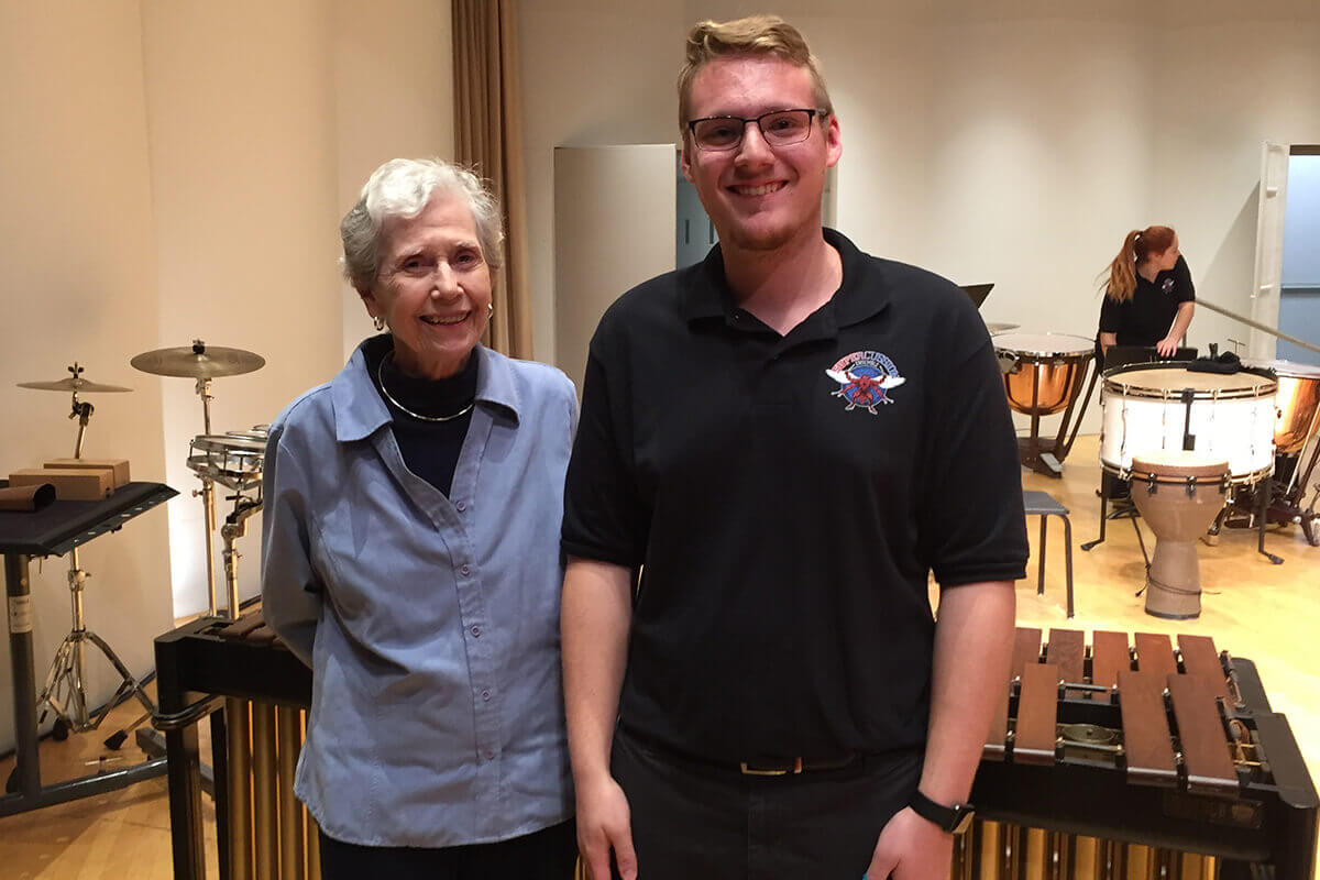 At the (SU)PERcussion fall concert Nov. 4, the (SU)PERcussion Ensemble honored Winchester resident Martha Edmiston, who donated a beautiful Musser Marimba to the percussion studio. In honor of her generous donation, Michael Dolese ’21 (Bachelor of Music in Music Education) performed “Echoes” by Kevin Bobo on the new marimba during the fall concert. The studio also presented her with a signed picture of the ensemble with her marimba.
