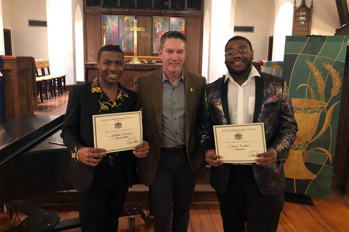 On Saturday, March 9, singers from Shenandoah Conservatory competed in Bethesda, Maryland, at the Sue Goetz Ross Memorial Voice Competition presented by the Friday Morning Music Club, Inc. Bass Jonathon Edwards ’20 tied for third place, and soprano Franchesca Henry ’20 and baritone Daniel Burston ’21 received honors. All three students are currently pursuing a Bachelor of Music in Performance (Voice). Edwards and Burston study with Chair of the Vocal/Choral Division and Associate Professor of Voice (Tenor) Byron Jones ’04, D.M.A., and Henry studies with Adjunct Associate Professor of Voice (Soprano) Dawn Kotoski-Shicoff, M.M.