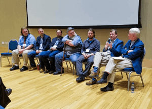 The panel of the interdisciplinary, history-focused Virginia Forum, held March 14 through March 16, at Longwood University, featured a sizable Shenandoah contingent, which included Director of the McCormack Civil War Institute and Adjunct Assistant Professor of History Jonathan Noyalas (AS ’01). The panel discussion and demonstration explored new opportunities for employing virtual reality to present and dramatize historical subjects and moments. The discussion included dramatizations of student-led, lunch-counter sit-ins of the Civil Rights era, the trial of John Brown in 1859, and debates in the Constitutional Convention of 1787 about the election of the president, which led to the creation of the Electoral College. (Pictured second to the end.)