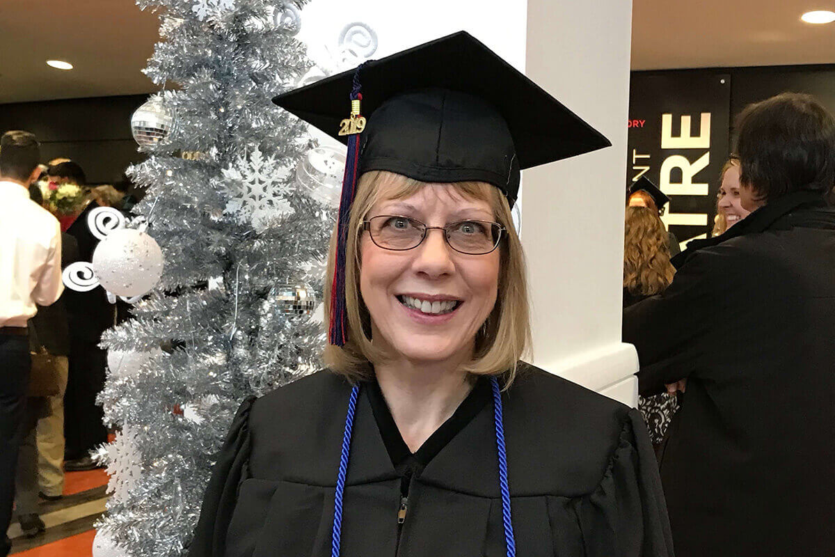 Cynthia Dove is a December 2019 graduate of the Accelerated Second Degree (ASD) Bachelor of Science in Nursing (BSN) program at Shenandoah University. Like a majority of the students in the ASD BSN program, Dove had a degree and job in another field prior to becoming a nursing student. Dove’s story is a little more unusual, however, because she had earned her Bachelor of Business Administration and Master of Education degrees many years earlier and held jobs in the financial services industry for over 20 years – working her way up to chief operations officer and vice president. While she had a wonderful career helping clients with their financial health, Dove said she has always felt a calling to be a nurse and help people with their physical health. So when an opportunity presented itself for her to pursue her dream, she said she “decided it was time to do what was in my heart. It was time for me to give and serve others. One gets to a point in life where you want to feel like what you do matters — at least to you.”