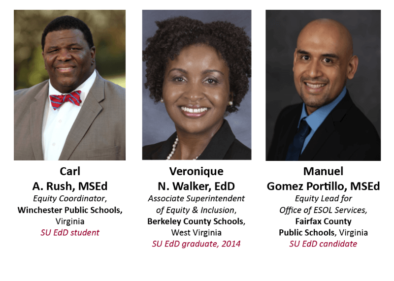 The session will be led by three Shenandoah alumni educational leaders who are working to advance equity in their school systems: Carl A. Rush, M.S.Ed., equity coordinator at Winchester Public Schools; Veronique N. Walker, Ed.D., associate superintendent of equity and inclusion at Berkeley County Schools in West Virginia; and Manuel Gómez Portillo, M.S.Ed., equity lead for the Office of ESOL Services at Fairfax County Public Schools.