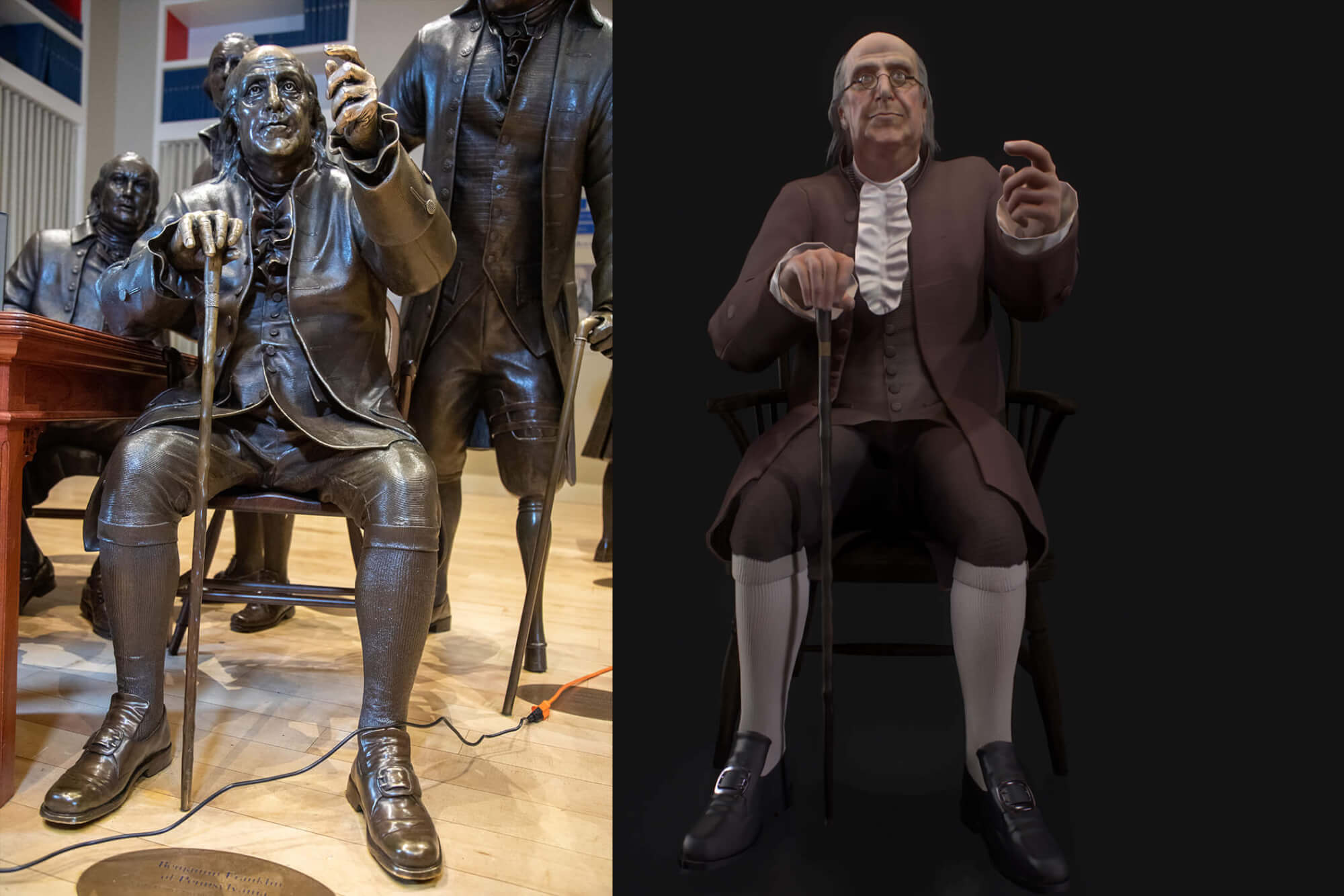 Providing the basis for the experience are CGI-generated avatars based on three-dimensional scans of the founders’ statues at the National Constitution Center. These avatars are voiced by professional actors using scripts prepared by project historians.