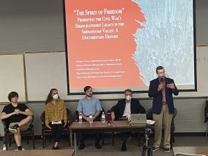 On Sept. 20, the MCWI held its first public event as an affiliate partner in the CIC’s Legacies of American Slavery project in Henkel Hall, Hester Auditorium. A panel that included Noyalas, Bridgewater College Professor Emeritus Stephen Longenecker, Ph.D., Shenandoah graduates Steven Stabler ’21 and Jamie Hunstad ’20, and SU history student Brennan Komelasky ’25 revealed some of its initial findings from 18 months of research into commemorations of the Emancipation Proclamation in the Shenandoah Valley and the other ways Blacks in the area attempted to safeguard the Civil War’s emancipationist legacy in the region.