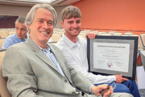 Giles Jackson, Ph.D., director of the Institute for Business, Sustainability & Society, recognized Finn Swafford ’24, BBA/Concentration in Management, of Stafford, Virginia, as the first business student to complete the four-course Sustainable Business Certificate.