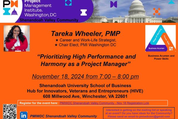 The Project Management Institute, of Washington, D.C. (PMIWDC) and the Shenandoah Valley community will host “Prioritizing High Performance and Harmony as a Project Manager,” featuring…