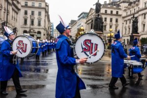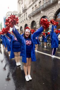 Marching band members weathered soggy conditions during the parade, traversing the two-mile parade route in a steady rain that did little to dampen the excitement of the band’s first international appearance. Members of the marching band – including the rock band and color guard – and SU cheerleaders spent hours marching and performing in front of a cheering street crowd that included SU President Tracy Fitzsimmons, Ph.D., and an international TV audience that annually reaches over 500 million.