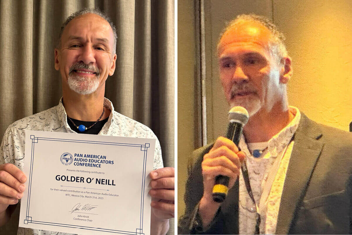 Director and Professor of Music Production & Recording Technology Golder O’Neill ’92, M.M.E., participated in the Pan American Audio Educators Conference in Mexico City during the last week of March. He was a part of several presentations and discussions regarding audio education. Several topics were presented and discussed, including “How Are We Teaching Critical Listening?,” “How Are Educators Implementing Immersive Audio Within Our Programs?” and “Strategies for Student Engagement Across Cultural Boundaries.”