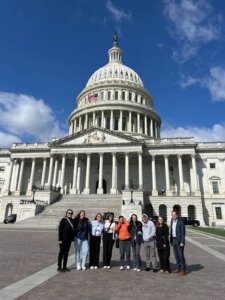 Dr. Blight and eight students – Emma Johnson ’26, Lauren Cruz ’26, Bailee Martin-Irving ’25, Tyrone Garcia ’27, Taylor Reynolds ’25, Kathy Rodriguez ’27, Leanna Myers ’25 and Aurora Padilla Jimenez ’26 – visited the U.S. Capitol in Washington, D.C., in April and watched as members of the U.S. House of Representatives debated the issue of tariffs on the House floor. Additionally, students tour the Capitol and walk through the tunnels located beneath the building, and attended a courtroom lecture at the Supreme Court Building.