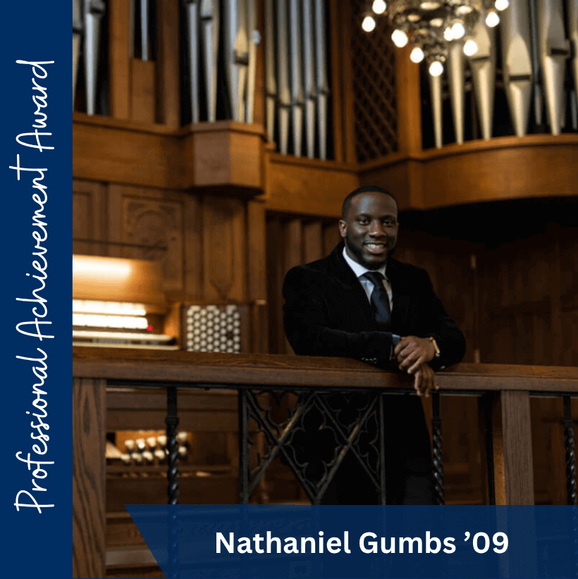 Nathaniel Gumbs ’09 earned a Bachelor of Music in organ performance from Shenandoah Conservatory. He completed a Master of Music in organ performance and Certificate in Sacred Music from Yale University. In addition, Nathaniel was awarded a Doctor of Musical Arts in organ performance and literature from Eastman School of Music.