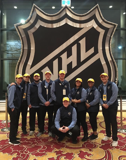 Nine students volunteered at the 2020 NHL All-Star game in St Louis, Missouri in 2020. The students worked the NHL Fan Fair events at Union Station in downtown St. Louis. The team’s responsibilities included ticket check-in at the entrance to Fan Fair, serving as instructors with various hockey games in the NHL Kids Zone, and assisting with the setup for NHL mascot events.