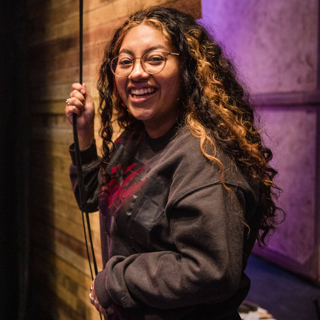Evelyn Gomez ’25 (B.F.A. in Theatre Design & Production (Stage Management) at work behind the scenes for Shenandoah Summer Music Theatre’s opening production of “42nd Street” (photo by C. King Media).