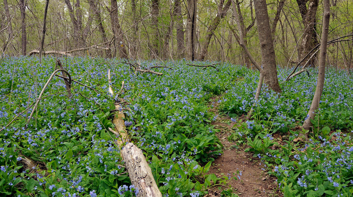 Beautiful Virginia bluebells bloom along the river in spring. More than three dozen other spring wildflower species also grow on the property and along the entrance road, including twinleaf, early saxifrage, spring beauties, and Dutchman’s breeches. Meadow plants bloom in the summer and fall, as do plants growing on the rock outcrops.