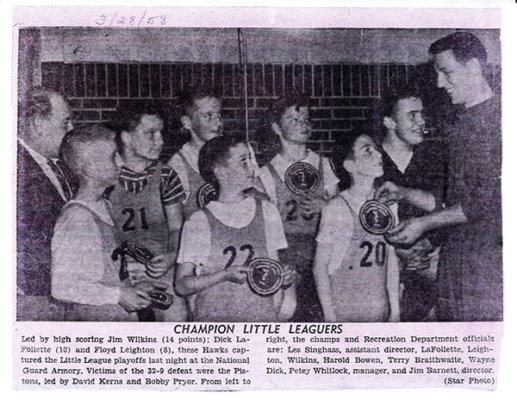 Led by high scoring Jim Wilkins (14 points); Dick LaFoliette (10) and Floyd Leighton (8), these Hawks captured the Little League playoffs last night at the National Guard Armory. Victims of the 32-9 defeat were the Pistons, led by David Kerns and Bobby Pryor. From left to right, the champs and Recreation Department officials are: Les Singhass, assistant director, LaFolletts, Leighton, Wilkins, Harold Bowen, Terry Braithwaite, Wayne Dick, Petey Whitlock, manager, and Jim Barnett, director.”