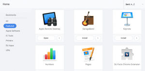 Browse the apps available and click “Install” to install an app on your Mac. Be sure to check regularly for new apps. You don’t have to install all the apps, only the ones you want or that your professor requires. It is your responsibility to keep the apps and OS on your Mac updated. You can check for Apple Software Updates and Microsoft Office Updates, install Flash and Java updates and the latest web browsers, through Self Service.