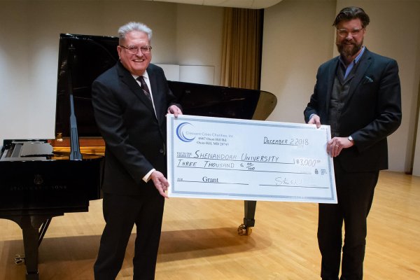 Mr. Richard Lawson, treasurer for Crescent Cities Charities, Inc. presented Shenandoah Conservatory Dean and Professor of Music Michael Stepniak, Ed.D., with a $3,000 grant award…