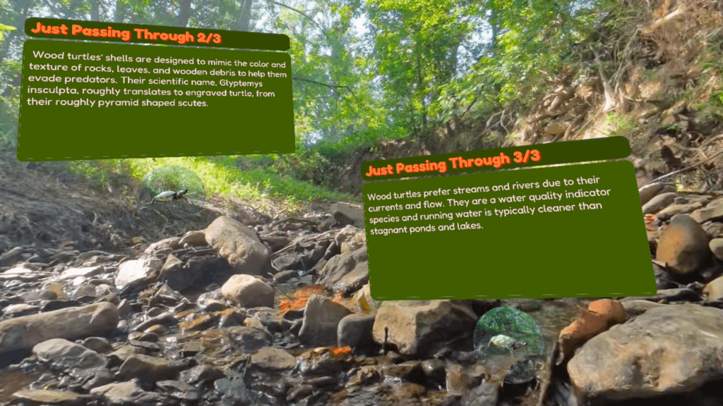 BRWC: Wood Turtle Habitats is an exploration of the ecosystems inhabited by the North American Wood Turtle (Glyptemys insculpta), which thrives in the eastern part of the United States and Canada. Designed as part of an interdisciplinary online curriculum, this relaxing educational VR experience uses pop-up information and 360 videos, including underwater footage, to show you a turtle’s perspective on the world. Bask on a log, explore low-lying areas, and swim in turbulent streams. Learn to think and live like a wood turtle!