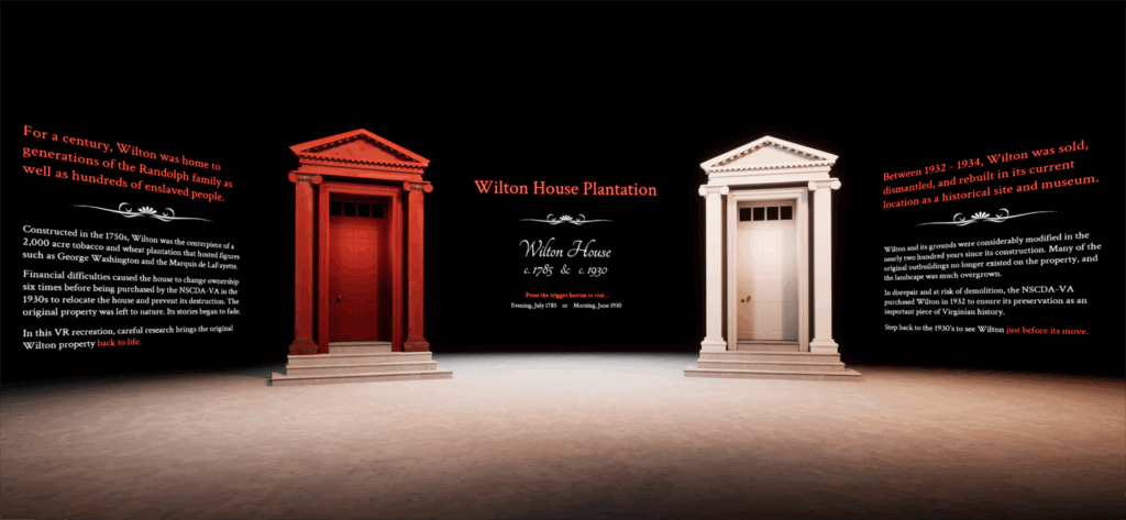 The Wilton House VR project recreates the original 2,000-acre tobacco plantation in its original setting on the James River near Richmond, VA and is available to view at the Wilton House Museum. Visitors can virtually explore the original site of the house, outbuildings, structures occupied by enslaved workers, and many other aspects of the original property that are now lost to history. The project also shows the Wilton property as it looked during the 1930’s, shortly before the house was moved to its present location.