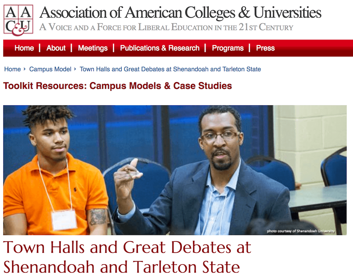 Shenandoah University’s general education town hall program was recently featured on the Association of American Colleges & Universities’ website, in an article about adaptations of California State University–Chico’s town hall and Great Debate models.